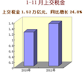 王勇指出,2011年中央企業認真貫徹落實黨中央、國務院各項決策部署,生產經營總體上保持平穩較快增長,主要經濟指標創歷史新高。1-11月,累計實現營業收入18.4萬億元,同比增長22.6%;累計實現凈利潤8317.9億元,同比增長3.6%;上交稅金1.52萬億元,同比增長24.8%,增速比營業收入高2.2個百分點,比凈利潤高21.2個百分點;截至11月底,中央企業資產總額達到27.8萬億元,同比增長16.5%;凈資產10.5萬億元,同比增長12.8%。