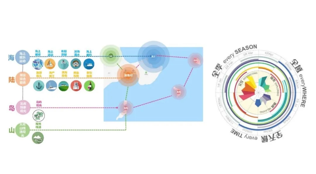 設計團隊為滿足多節點、多層次、多樣性的旅游和生產生活需求,在時間上,堅持“全季節、全天候”的產業項目策劃,遵循當地漁業作息規律,引導游客、村民進行濱海技藝觀賞和節慶互動;在空間上,融合“山-陸-海-島”的聯動發展模式,將海上娛樂、商業服務、自然觀光相結合,塑造山海一體的澳角村度假品牌形象。
