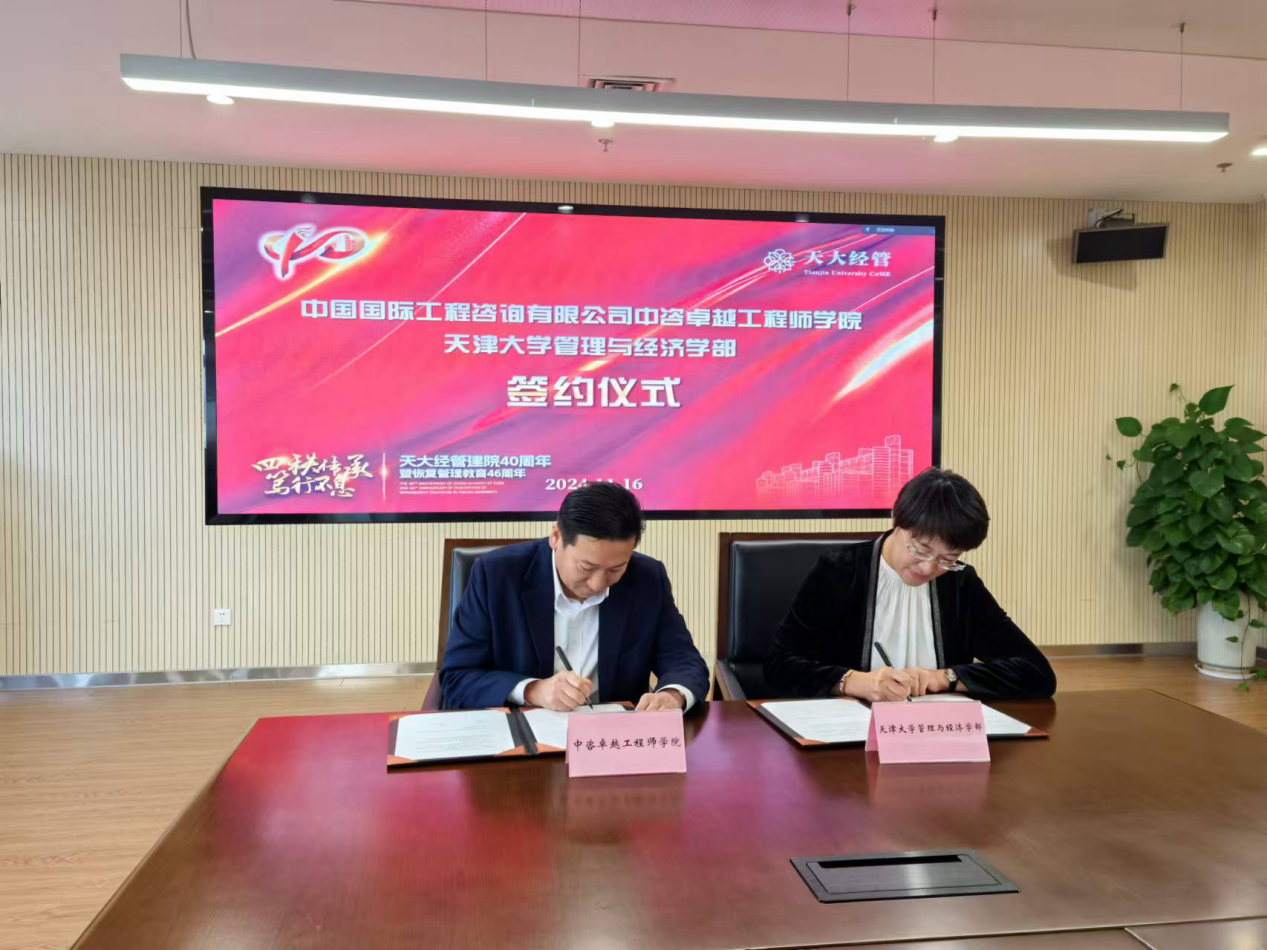 2024年11月16日上午,中咨卓越工程師學(xué)院與天津大學(xué)管理與經(jīng)濟(jì)學(xué)部(以下簡(jiǎn)稱經(jīng)管學(xué)部)在天津大學(xué)舉辦合作簽約儀式。中咨公司黨委副書記、董事朱嵐,黨委委員、專家學(xué)術(shù)委員會(huì)常務(wù)副主任、中咨戰(zhàn)略研究院執(zhí)行院長(zhǎng)竇皓,天津大學(xué)黨委副書記、紀(jì)委書記、國家監(jiān)委駐天津大學(xué)監(jiān)察專員李煒出席儀式。中咨卓越工程師學(xué)院、天津大學(xué)經(jīng)管學(xué)部相關(guān)負(fù)責(zé)同志、工作人員,以及部分師生代表參加活動(dòng)。