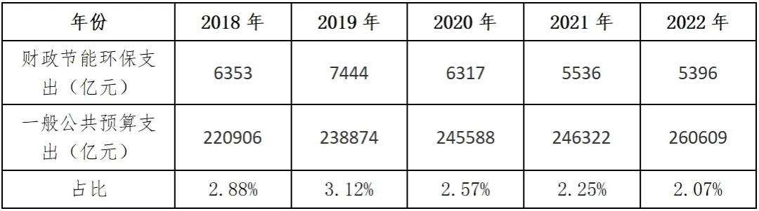 雙碳”目標下綠色財政支出政策研究 姜楠楠 陳少強 財政是國家治理的基礎和重要支柱,生態環境作為居民生活最重要的公共產品之一,因其外部性特征向來是財政資金支持的重點領域。特別是黨的十八大以來,黨中央高度重視生態文明建設發展,提出了一系列具有重大影響和深遠意義的新理念、新思想、新戰略,財政部門綜合運用財政補貼、專項資金、轉移支付、政府采購等方式協同推進生態環境質量提升。2020年9月,中國提出二氧化碳排放力爭在2030年前達到峰值,努力爭取2060年實現碳中和的“雙碳”目標,綠色財政支出持續發力,為我國“雙碳”目標實現發揮了不可替代的作用。 一、“雙碳”目標下的綠色財政支出特征 (一)綠色財政支出強度不斷提升 黨的十八大以來,財政一般公共預算支出中用于節能環保的財政支出規模保持平穩,占一般公共預算支出比重基本維持在2%-3%之間,持續支持污染防治、生態保護以及節能減排等項目。具體見下表1: 表1 2018年-2022年全國一般公共預算支出中節能環保支出及占比情況
