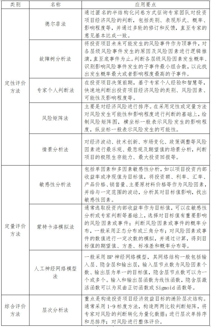 新形勢下投資項目經濟風險管控思路研究 劉義成 摘要:投資項目經濟環境不確定性主要體現在經濟波動、市場變化、技術創新及政策調整等方面,對其分析評價需要把握好全面性、系統性、動態性及定性與定量相結合原則,并選擇適合的定性、定量和綜合評價方法。隨著投資項目國際國內環境的變化,為增強投資項目應對經濟風險的風險回避、風險減輕、風險轉移和風險接受等策略實施的有效性,應強調經濟分析的基礎性地位,加強內外部資源整合,推動風險管理的方法和工具創新,完善投資項目經濟風險管控措施。 關鍵詞:投資項目;經濟風險;分析評價;管控策略 風險可控性是投資項目可行性研究的核心目標之一,主要強調對項目全生命周期包括建設、運營、融資等專項風險的識別,對風險發生可能性及影響程度的評估,以及對主要風險管控方案和重大風險應急預案的制定。從投資項目面臨的內外部風險因素看,外部因素包括政治、經濟、社會、自然等方面,內部因素包括資金、設計、人員、管理、制度等方面。在全球經濟一體化深入發展、我國社會主義市場經濟體制不斷完善及現代化企業制度逐步建立的背景下,未來投資項目全生命周期風險管控需要重點加強經濟風險的分析評價和應對工作。 一、投資項目經濟風險的內涵及特征 (一)投資項目經濟風險的內涵及主要類別 1.經濟風險內涵 國際標準化組織(ISO)發布的ISO31000:2018《風險管理指南》中對風險的定義是“不確定性對目標的影響”,并進一步說明這種影響是與預期的偏差,包括積極的、消極的或兼而有之。對于投資項目而言,經濟風險是指經濟環境的不確定性對投資項目經濟效益、可持續發展等目標的影響,主要強調的是風險源或風險因素,結合風險事件、可能性及后果等要素共同構成完整的風險表示。在國際國內發展環境復雜多變的新形勢下,投資項目經濟風險內涵的深刻變化體現在:一是不確定性方面,主要是難以預測或不可預測的風險事件頻發;二是投資項目的預期目標方面,相較于傳統的對目標的不確定性影響分析,更需要強化不確定性分析對形成合理有效投資目標的支撐作用;三是影響方面,既要分析損失影響,也要分析可能帶來的收益影響。 2.主要類別 投資項目所處外部經濟環境的不確定性,主要體現在經濟波動、市場變化、技術創新及政策調整等方面,具體如下: 經濟波動。在當前大國博弈加劇、地緣政治沖突、經濟制裁頻發的大環境下,全球經濟發展面臨著諸多潛在風險,造成投資項目的目標確立和風險管理愈發困難。宏觀經濟的波動會造成投資和消費的預期及通貨膨脹率、利率、匯率等產生變化,從而對投資項目的規模、進度、成本、收益等產生直接或間接影響,如在經濟高速增長期,市場需求旺盛,容易產生較高的投資回報預期,而在經濟下行或進入蕭條期,市場需求低迷,營收不及預期,容易導致資金鏈斷裂,影響項目持續運行。 市場變化。投資項目面臨的市場變化風險主要是投入物和產出物的價格和量的波動,在當前形勢下,需要重點關注原材料或其他重要投入物的價格上漲風險、產業鏈供應鏈穩定風險、產品價格下行及需求不足風險等。 技術創新。隨著全球創新步伐加快,新材料、新工藝、新技術等不斷涌現,使得投資項目面臨的技術環境不確定因素增多,主要表現在技術更新換代快、技術轉化難度高等方面。投資項目需要不斷加強創新成果的應用,才能通過降低生產成本、提高產品質量等措施增強產品的市場競爭力,但同時也可能面臨技術不成熟、技術轉化不成功等帶來的損失風險。 政策調整。現階段,我國正處于以經濟體制改革為牽引推動全面深化改革時期,未來經濟政策主要向著宏觀政策取向一致性、科技創新、高水平對外開放、擴大內需等方面演變,具體包括產業政策、財稅政策、金融政策等政策調整,這些政策調整可能會對投資項目建設規模、技術路線、融資成本、經營成本、稅負成本等方面產生影響。 (二)投資項目經濟風險的主要特征 投資項目是社會擴大再生產的重要手段,屬于高度復雜的經濟社會活動,因此,其經濟風險的特征除不確定性外,還包括關聯性、傳導性、隱蔽性及相對可控性等,深入理解和把握這些特征,是有效管控經濟風險、保障項目成功實施的關鍵。具體如下: 不確定性是指宏觀經濟波動、產品市場變化、技術革新等風險因素發生的概率、時間、影響范圍及程度等很難精準預測,因此,即使投資項目在項目立項決策階段對宏觀經濟、產品市場等做了充分的調研預測,但實際運行結果仍有可能偏離預期。 關聯性是指經濟風險的發生可能關聯多個風險因素、涉及多個項目環節、影響多個控制目標,如投資超支風險,關聯的經濟風險因素可能包括政策、市場、技術等,涉及的項目環節可能包括設計、融資、采購、運營等,影響的控制目標可能包括運營成本、投資回報等。 隱蔽性是指由于認知和技術手段等缺陷,導致某些經濟風險在項目初期被忽略,隨著項目的逐步實施,對項目的潛在影響逐步顯現,最后導致項目投資產生巨大損失。 相對可控性是指相對政治風險、社會風險等,經濟風險可以通過采取一定的措施,有效降低其發生的概率、影響范圍和程度,如與其他方共同投資、做好項目前期風險識別及應對工作、提高管理人員的業務素養和