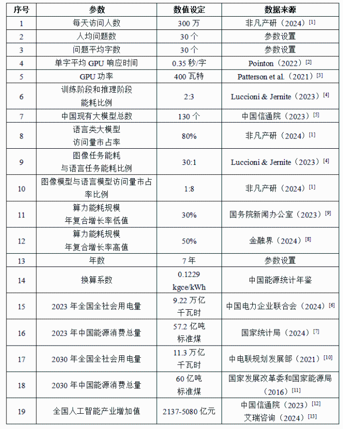 計算過程的參數設置與數據來源如下表所示。在人工智能大模型能耗現狀計算方面,主要參數包括每天訪問人數、人均問題數、問題平均字數等。其中,每天訪問人數、語言類大模型訪問量市占率、圖像模型與語言模型訪問量市占率比例均來自非凡產研[1]的2024年度報告。單字平均GPU響應時間數值來自Pointon(2022)[2],即0.35秒/字。根據Patterson等人[3]的研究結果,GPU功率為400瓦特。基于Luccioni & Jernite(2023)[4],語言類大模型訓練和推斷階段的能耗比例為2:3,圖像任務能耗與語言任務能耗比例為30:1。中國現有大模型總數來自中國信通院(2023)[5]。在計算2023年人工智能電耗與能耗占全國電耗與能耗比重時,所使用的2023年全國全社會用電量數據來源于中國電力企業聯合會(2024)[6],2023年中國能源消費總量數據來源于國家統計局發布的年度報告[7]。此外,人均問題數與問題平均字數均基于行業常規均設置為30個。