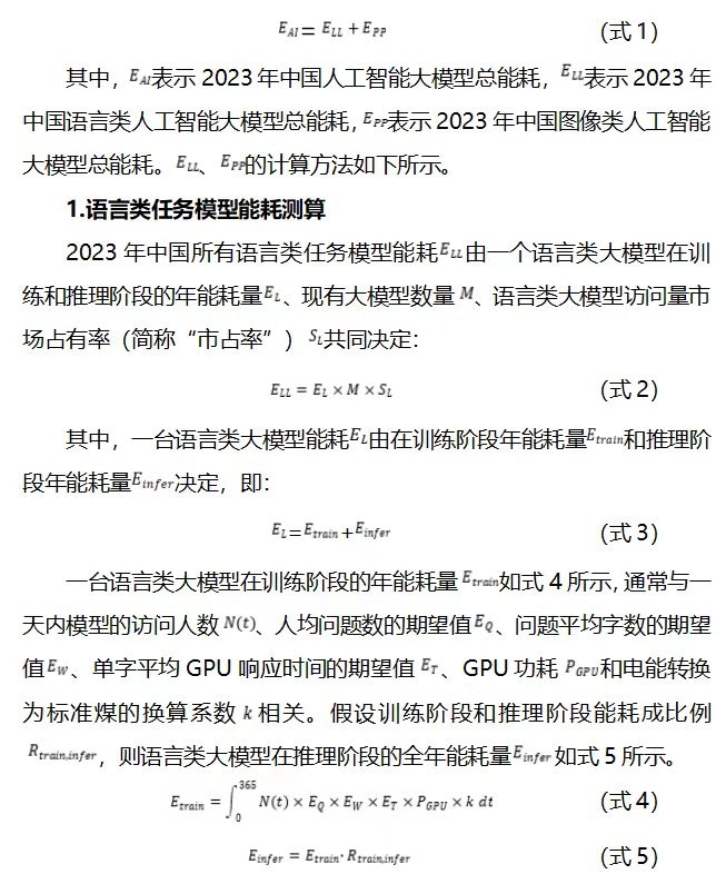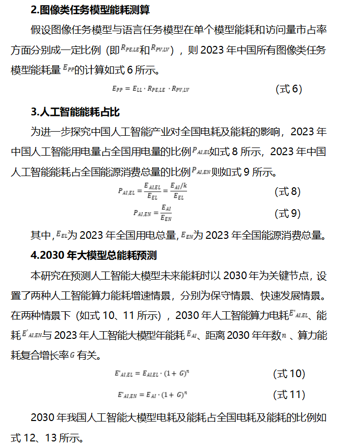 本研究基于人工智能領域相關政策文件、研究報告、學術文獻等最新信息,構建了以語言類大模型和圖像類大模型能耗情況為代表的人工智能大模型能耗計算方法,并對我國人工智能發展的能耗影響進行了測算分析。