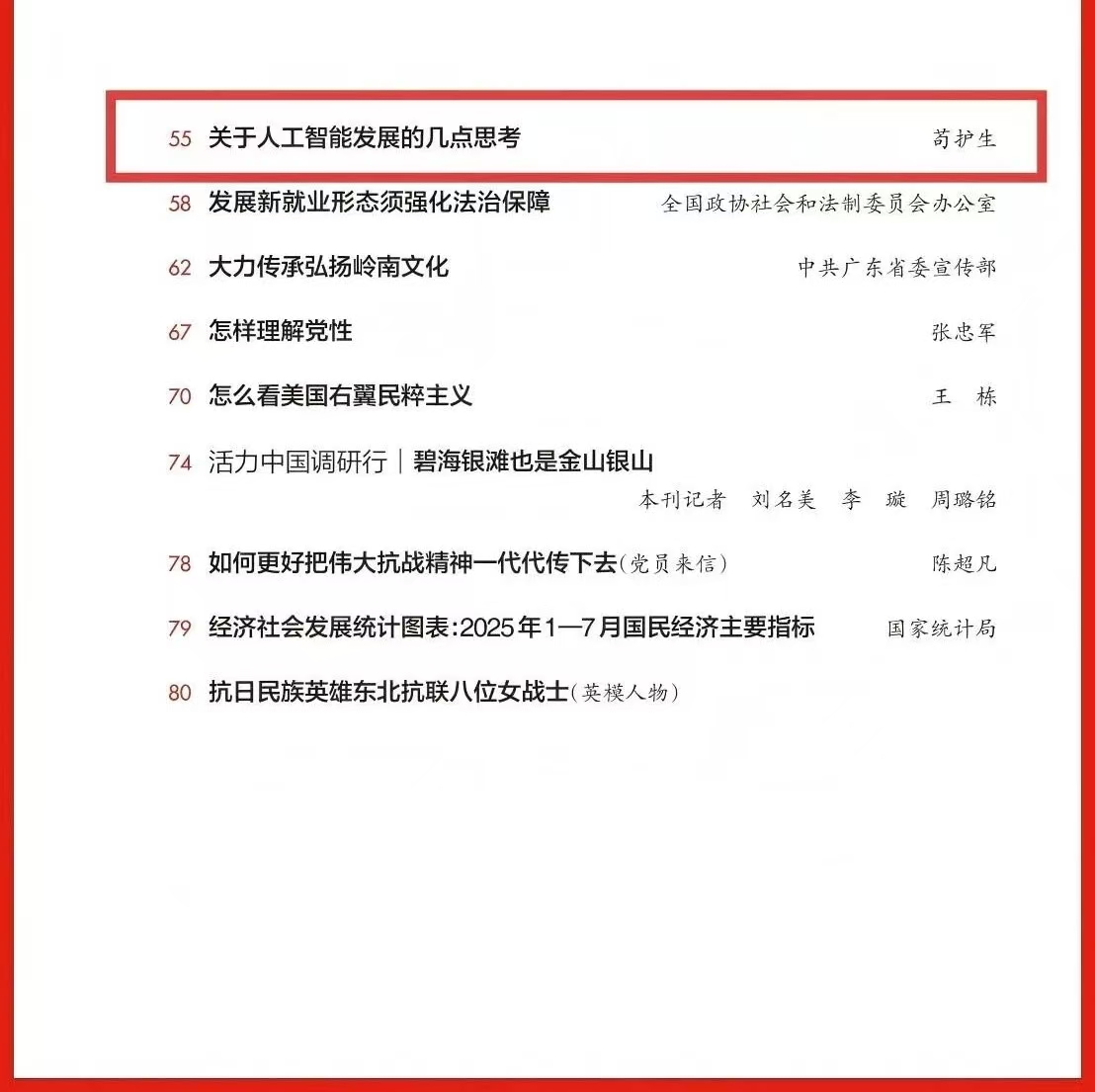 編者按:9月1日出版的2025年第17期《求是》雜志刊發(fā)公司黨委書記、董事長茍護生同志理論文章《關于人工智能發(fā)展的幾點思考》,文章立足全球人工智能發(fā)展浪潮,緊扣我國人工智能產業(yè)實際,以辯證思維深入剖析創(chuàng)新與開放、發(fā)展與安全、政府與市場、應用與治理的內在邏輯關系,在搶抓人工智能發(fā)展機遇、直面技術應用風險挑戰(zhàn)中,為推動人工智能與經濟社會深度融合、助力我國搶占全球科技競爭主動權提供了有益借鑒。現予以轉載,供學習參考。 關于人工智能發(fā)展的幾點思考 茍護生 近年來,以大模型為代表的人工智能迎來新的發(fā)展浪潮,正以前所未有的速度深入滲透經濟社會發(fā)展的方方面面,貼近每個人的生活和工作,深刻重構著人類社會生產力和文明形態(tài)。習近平總書記指出,人工智能是新一輪科技革命和產業(yè)變革的重要驅動力量,將對全球經濟社會發(fā)展和人類文明進步產生深遠影響。當前,全球主要國家都在搶抓人工智能發(fā)展機遇。近日,國務院印發(fā)《關于深入實施“人工智能+”行動的意見》,明確實施“人工智能+”行動的總體要求、發(fā)展目標和重點方向,為進一步推動人工智能與經濟社會各行業(yè)各領域廣泛深度融合提供了方向指引。我們要深刻領會習近平總書記關于人工智能的重要論述,把握好創(chuàng)新與開放、發(fā)展與安全、政府與市場、應用與治理的辯證關系,立足產業(yè)發(fā)展需求,順應治理變革趨勢,走出一條具有中國特色的人工智能發(fā)展之路。 自主創(chuàng)新與開放合作的辯證統一。習近平總書記強調,“自主創(chuàng)新是開放環(huán)境下的創(chuàng)新”。這一重要論斷為處理好人工智能技術自主與全球化協作提供了根本遵循。 自主創(chuàng)新是人工智能發(fā)展的“根”,沒有核心技術的自主化,開放合作就可能淪為“依附式發(fā)展”,在關鍵領域受制于人。2018年以來,面對美國對人工智能和芯片等高技術產業(yè)的嚴密封鎖和瘋狂打壓,我國始終堅持自主創(chuàng)新,在芯片結構、核心算法等底層技術領域實現突破,初步構建了自主化的產業(yè)生態(tài)。例如,深度求索公司通過自主優(yōu)化算法架構,用遠低于國際同類產品的成本,達到了相近的性能水平。再如,我國企業(yè)在激光雷達、高精度地圖等關鍵環(huán)節(jié)的自主創(chuàng)新,讓我國躋身自動駕駛領域領先國家。這些技術的突破離不開我國良好的自主創(chuàng)新條件。國內超大規(guī)模市場是人工智能技術落地與迭代的“試驗場”,我國擁有全球最大的數字經濟市場,為人工智能應用提供了豐富場景;國內完整的產業(yè)鏈體系,為人工智能技術的自主發(fā)展提供了有效支撐。 自主創(chuàng)新并非“閉門造車”,堅持開放合作才能緊跟科技發(fā)展方向,避免裹足不前或淪為“技術孤島”。在基礎研究領域,全球開源社區(qū)貢獻的TensorFlow、PyTorch等深度學習框架,為我國人工智能創(chuàng)新提供了底層支撐,我國也依靠大模型的開源生態(tài),打破了美國科技巨頭的封閉系統壟斷,為全球人工智能發(fā)展提供了中國解決方案。在高端人才方面,全球頂尖人工智能研究者分布具有分散性,需要通過國際交流集聚智慧。人工智能治理是全球性的挑戰(zhàn),需要各國攜手共進。在大國科技博弈加劇的背景下,國際人工智能治理呈現多極化競爭與碎片化合作并存、技術標準爭奪與倫理價值博弈交織的復雜態(tài)勢。美國利用技術霸權塑造全球人工智能領導力,歐盟以立法監(jiān)管為導向鞏固在人工智能全球治理中的領導地位,我國則堅持以開放合作的姿態(tài),主張通過“技術共享、能力共建”縮小數字鴻溝,并通過世界人工智能大會等國際平臺提出人工智能治理方略,為全球人工智能治理提供有益參考。 7月26日至28日,2025世界人工智能大會暨人工智能全球治理高級別會議在上海舉辦。“智能時代 同球共濟”的主題貫穿始終,為全球人工智能領域帶來一場思想與創(chuàng)新碰撞的盛宴。圖為參觀者在中國南方電網展區(qū)拍攝“悟空”帶電作業(yè)機器人。 新華社記者 陳浩明/攝 實踐表明,自主創(chuàng)新是開放合作的根基,開放合作是自主創(chuàng)新的助力,唯有將二者有機結合,才能讓人工智能在安全可控的前提下釋放最大價值。我國人工智能發(fā)展,必須堅持自主創(chuàng)新與開放合作的辯證統一,通過國內市場的“厚度”支撐技術創(chuàng)新的“深度”,通過國際合作的“廣度”拓展技術價值的“高度”,確保人工智能既服務于國內高質量發(fā)展,又助力我國在全球競爭中占據主動,努力形成“以我為主、開放共贏”的新格局。 發(fā)展與安全的動態(tài)平衡。很多技術都是“雙刃劍”,一項新技術的突破,在帶來生產力躍升的同時,往往也伴隨著潛在風險。安全是發(fā)展的前提,發(fā)展是安全的保障。發(fā)展人工智能必須遵循技術演進規(guī)律,守牢國家安全底線。 近年來,生成式人工智能的廣泛應用改變了多個行業(yè)的生產模式,同時也帶來不少問題和風險。例如,生成式人工智能在內容創(chuàng)作領域的爆發(fā)式創(chuàng)新,可能引發(fā)深度偽造、信息操縱等安全威脅。在意識形態(tài)方面,大模型在數據投喂、算法訓練等環(huán)節(jié)易受到操縱,